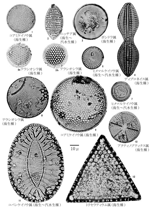 ケイ藻の化石もよく地層の堆積環境をあらわす。貝類群集を調べたものと同じ試料にふくまれているケイ藻の遺骸群集の移り変わりを検討した宮原幸子さん(神戸大学)の研究によれば、8,000年代に入ると急速に海生種が増加し、この時期に海水が大阪湾内にも大量に流入し、海面が上昇したことを示している。