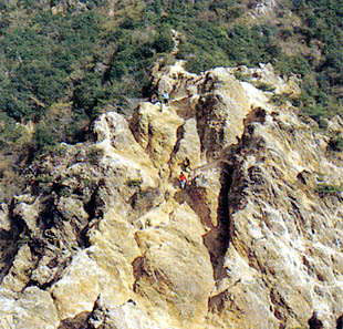 やせ尾根のキレット(切戸)状の落ち込みは、強い圧力がここに集中して、花こう岩が破壊され、風化がいちだんと進んだいわゆる断層破砕帯である。
