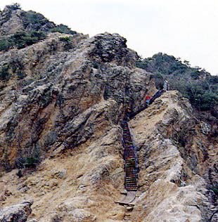 上の顕微鏡写真は花こう岩をつくっている石英の拡大写真であるが、黒い部分に無数に刻まれている0.1〜0.2mm間隔の細かいひび割れが認められる。このように鉱物レベルまで破壊され、そこに雨水がしみこんで長石などは粘土になり、写真の石英は細かい砂に風化が進んでいく。そして長い年月の間にこのやせ尾根のように変容していくのである。
