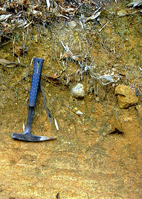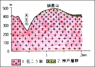 天王川から鍋蓋山の西の肩に手がとどきそうになったとき、高圧線の真下を通る。そのとき小さい円い礫を拾った。はじめは鉄塔工事のときのコンクリート打ちのこぼれたものかと思った。しかし忘れかけた頃にポロッと見つかる。しかも道だけではなく林の中にもある。鍋蓋山頂あたりから連続して出てくる。しめたと思った。六甲山が上昇を起こす前にここにあった神戸層群の地層中の礫がわずかに残っているものなのだ。湖底に神戸層群が堆積していたとき、六甲山はまだ上昇運動をしていなかったことを示す直接の証拠の発見である。