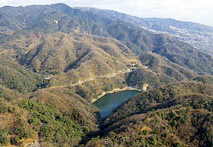 布引水源池。手前中央の影になっている谷を布引断層が通り、池の対岸の影の部分につながる。ここでは断層破砕帯がみえる。