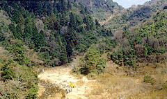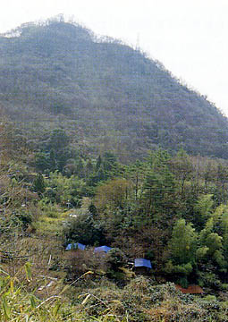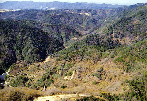 | 尾根から振り向けば、22年前の昭和42年、多くの人命を奪った山崩れのあとが斜面に溝状に残る。 |