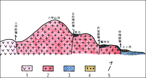 1.有馬流紋岩,2.六甲花こう岩,3.大阪層群,5.断層