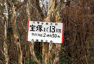 宝塚へ向う全山縦走のコースの標識は、石宝殿を過ぎて、道路が大きく右折する所に立っている。ここからは騒々しい車やバイクと別れてほんらいの山歩きに戻れる。
