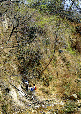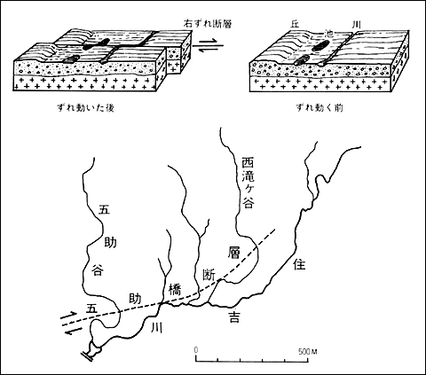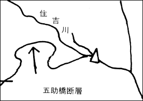 五助谷は本流の住吉川に合流する手前で大きく半円状に曲がって流れる。この曲がりの所に五助橋断層があらわれている。こうした断層に沿う曲がり(引きずり)は東の西滝ヶ谷でもみとめられる。これは断層を境にして北側が右方向に動いたために流路が変わったものである。