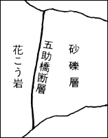 この五助橋断層は、東お多福山の丹波層群が、もとは五助ダムの南から金鳥山、保久良神社にかけて分布する丹波層群と一つづきであったものが、断層の活動でずれ動き、水平変位量4kmにも及ぶ大きな右ずれ断層であることがわかる(地質図参照)。