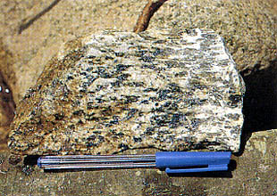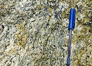花こう岩が圧し潰されて黒雲母が縞状になっている。 |