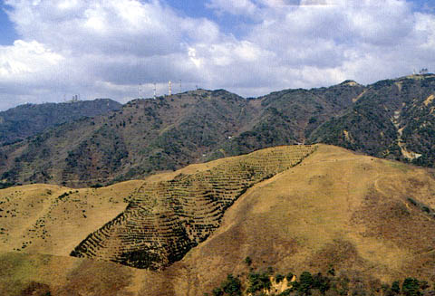 東お多福山の北の凹地形は大月断層、崩れは花こう斑岩のがけ。