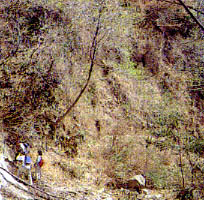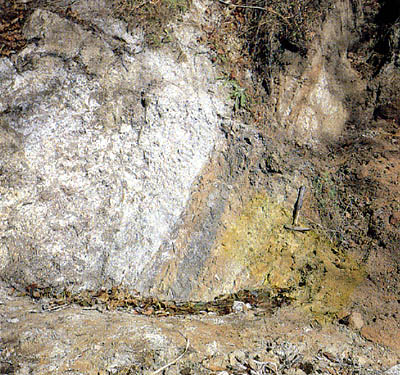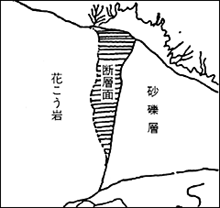 五助ダムに近い五助谷に写真のように断層によって破砕された花こう岩の粘土化した露頭がみられる。ここでの断層は北から東へ50度へのび、北西へ60度の傾斜を示す。