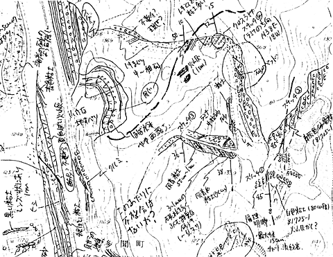 地質調査は、地形図とフィールドノートにスケッチや記録を書くことからはじまる。 |