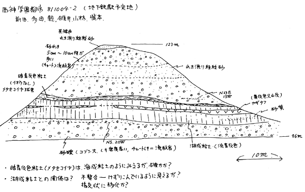 現在ではすでにありませんが、地下鉄の「学園都市駅」のできる予定地のあたりに30mほどの高さの崖がありました。「駅の崖」と呼んでいるそそり立つような大きな崖でした。6名はまずこの崖にあらわれた地層のくわしいスケッチと柱状図を作ることに挑戦しました。