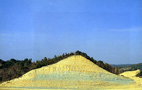 見はらしのよい崖の頂上からまわりを見まわします。南の方に現在ブルドーザーが入って切り取っている山があり、そこに粘土層が出ています。その西方にも粘土層が見えます。