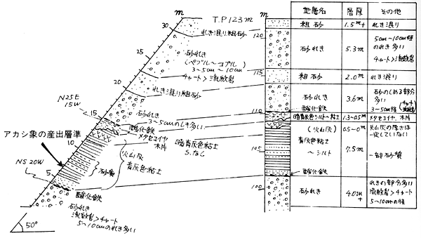 この柱状図で「淡青灰色粘土」と書いてあるのは、湖にできた粘土でアカシ象を発見した粘土と同じ粘土です。アカシ象の発見地点はこの崖の北西150mのところにあり直接つながっていくようすが観察できます。