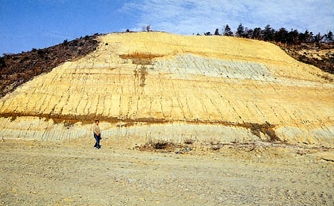 まず一番始めに地層の厚さを測るために崖の頂上まで登ってそこから巻尺をおろします。崖の一番下をゼロにあわせて、今度は下から一歩一歩登っていきます。はじめに崖の傾きをクリノメーターで測定します。崖の傾きは50度。屋内の非常に急な階段が45度、ベテランの登山家でもザイルを使って登る傾斜ですから相当危険な調査です。実際傾斜が45度を越す場合は、見た目には「直立する崖」と言ってもいいような感じを受けるものです。ブルドーザーで削り取る時にできた段が1m間隔ぐらいでありますからそれを一つ一つ登っていくことになります。