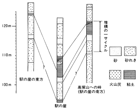 以下「駅の崖」と「若葉の大露頭」の地層の情報を手がかりに、どのように地層を対比し、層序を組み立てていったのかを述べていくことにします。