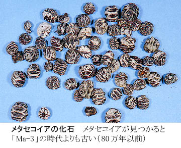 大阪平野では、このあたりと同じ時代(第四紀)の地層が広がっておりそれがかなりくわしく調べられています。その研究によるとメタセコイアの化石は、Ma3と名づけられた海成粘土よりも古い地層からしか発見されないことがわかっています。Ma3の時代というと大ざっぱに言えば今から約80万年前ということもわかっています。メタセコイアはこの80万年前に日本では滅びてしまったのです。