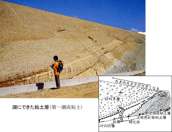 学園都市の西の端には、農地に水を供給する目的で小寺大池という池が作られています。もともとあった大門(だいもん)池と蓮(はす)池という昔からのため池を作りなおしたものです。小寺大池の周辺に湖成粘土が出ていました。それをくわしく調べていくうちに湖成粘土は1枚ではなく2枚あることがわかってきました。そこでその下の方の粘土を「第一湖成粘土」、上の方のものを「第二湖成粘土」と名づけました。第二湖成粘土のすぐ上には黒ぼい粘土が重なっておりメタセコイアの球果の化石が見つかりました。駅の崖と同じ関係です。駅の崖の粘土の下限は標高103mのところにあって、厚さは7mでした。小寺大池でこの粘土層は、74mの標高のところにあり厚さは10mです。ということはこの第二湖成粘土は東方では高い位置にあり、西に行く程だんだん深く入りこんでいくように伸びており地層の厚さはだんだん厚くなっていることになります。