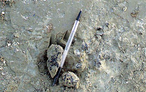 地層を対比していく時にわかりやすいのは粘土層です。砂層や砂れき層では変化も激しく、これと言った特徴がはっきりしません。それに比べ粘土層はふつうは広い範囲に連続して広がっている場合が多いのです。その上、粘土の中には化石が含まれていることが多くこの化石が地層の対比に大いに役立つのです。