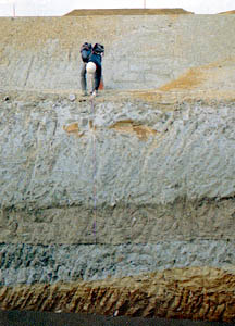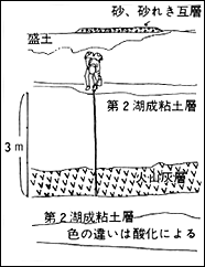 高塚山の露頭で海成粘土の中にピンク色の火山灰の層があること、下位の湖成粘土の上にかなり厚い黄色の火山灰の層があることは注目に値することでした。火山灰は、粘土や砂れきの地層と違ってある一時期に、その場の環境や条件の違いにかかわらずどこにでも降り積るものだからです。火山灰は地層を対比する時にしばしば決め手=鍵になることがあります。このような地層を「鍵層」(キイ・ベッド)と呼んでいます。