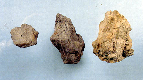 三つの火山灰のサンプル 左から右へ、ハシモトタフ、ヤギタフ、フジタタフ |