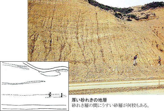 こうしてみると、小石や砂ばかりの砂れき層にも、一つは川の運んできた扇状地のれき、もう一つは波に洗われた海岸のれきというはっきりとした出生の違いがあったのです。