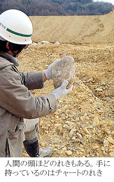 流紋岩とチャートのれきが、雑然と入っている。 |
