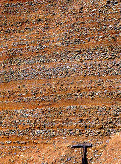 学園都市駅の崖の東方には、ほとんどが砂とレキからできた地層があることは前にもふれました。砂れき層は、地層の境の面がはっきりしないため、地層の傾きはわかりにくいものです。しかし写真のようにその中に砂だけでできた薄い層があったり、れきがきれいに並んでいたりする所があると傾斜がわかります。ここの砂れき層は15度から30度ほど西に傾いています。この砂れき層の厚さは実に数10mにもおよぶ厚い地層だとわかりました。もちろん砂れき層と言っても均一ではなくれきが大きい部分、れきが多い部分、少ない部分、れきが非常に少なく「れき混り砂」と言った方がいい部分といろいろな変化がありかなり複雑です。