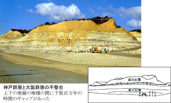 神戸層群は、今から千数百万年前のものであり、いっぼう砂れき層は、せいぜい古くても今から百万年ほど前のものですから、この色あいの違う二つの地層の間には、一千万年以上の時間の空白があることになります。西神総合運動公園のあたりでは、二つの地層は、どららも水平な地層ですが、明らかに不整合の関係であると言えます。