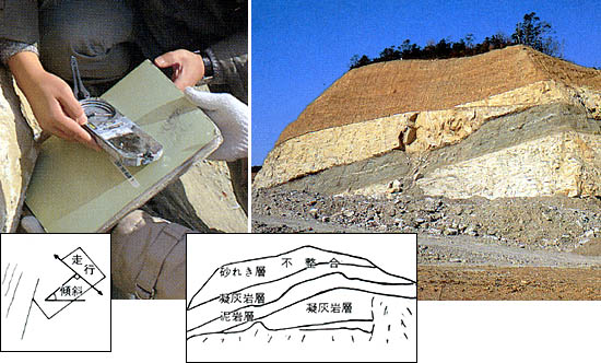 この二つの地層の重なりを、西の方へ追いかけていくと総合運動公園から学園都市にぬける峠のあたりで地層が傾いてくるのがわかります。水平であった地層がある地点で折り曲げられて西の方へ20度から30度ほど傾いているのです。