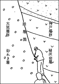 20度ほど西に傾いた神戸層群と、その上に重なる砂れき層を西へ見ていくと神戸層群は、やがて地下にかくれ、砂れき層だけが地表部にあらわれていることになります。その砂れき層を更に西の方へ追いかけていくと突然また地下にかくれたはずの神戸層群の凝灰岩と砂岩があらわれるのです。その境界が、70度の傾きをもった一つの面になっています。西側にあらわれた神戸層群の地層も、いままでと同しように約30度西に傾いているのですから、この面は、地層の重なりの面ではありません。この面こそ、私たちが、以前からさがしていた高塚山断層と名づけられた断層面だったのです。