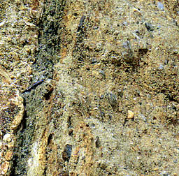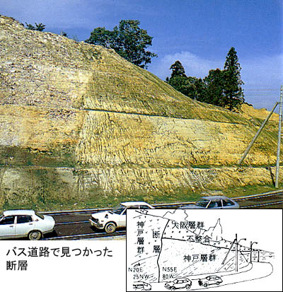 神戸市企画局から発行されている「神戸市および隣接地城地質図」を見るとちょうどこのあたりを、南北方向に伸びる一本の線が引いてあり 「高塚山断層」 と書いてあります。この断層を境にして東側には神戸層群、西側には大阪層群が分布するように色わけがしてあります。今、「以前からさがしていた高塚山断層」と書きました。というのは、このあたりに神戸層群と大阪層群を境する断層があるらしいということは以前からわかってはいました。しかし、これこそ高塚山断層と言える断層面の見える露頭は、これまで新幹線のトンネル工事の際に一部見られた以外は発見されていなかったのです。今までは、地層の分布と傾きからここに断層があるはずだという推定によって考えられた断層であったのです。その意味では、この断層がはっきりと地表にあらわれた姿を見た私たちは、「幻の断層、ついに姿をあらわす!」とでも表現したいような気分になりました。