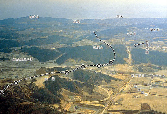 昭和56年8月、私たちは、このあたりで、二つの地層の関係と傾きを調べていました。その時給合運動公園の西のはしにあたり学園都市が見わたせる切割で、大阪層群の砂れき層と神戸層群の地層とが約70度の角度をなして接しているところを発見しました。