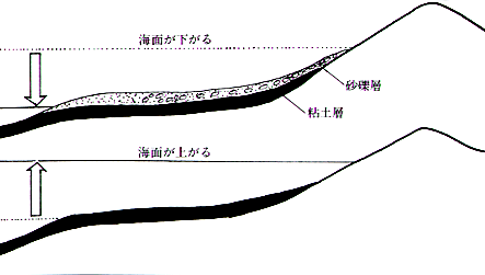 そのひとつは寒冷な気候(氷期)と温暖な気候(間氷期)が何回もくりかえし、それにともなって海面が上がったり、下がったりしたことです。
