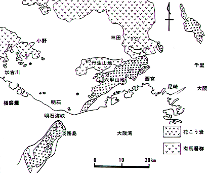 有馬層群と同じ時代に、地下深くでマグマが冷えかたまったのが六甲山地でみられる花こう岩です。有馬層群をつくつた火山のマグマは流紋岩質のもので、この花こう岩もよく以た組成のもので同時代のものです。地表で有馬層群をつくつた火山活動がおこっていたとき、地下深くでは花こう岩ができつつあったと考えられます。