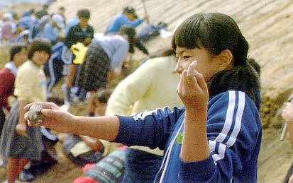 50万年前の貝化石を掘り出して、学習する小学生たち(1986年、西脇小)