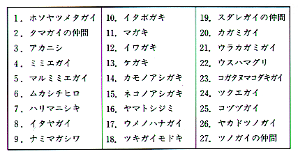 第三は浅い内湾の砂や泥の底にすむもので、ミミエガイ、マルミミエガイ、ウラカガミ、トリガイ、ツキガイモドキ、スダレガイ、ナミガイなどです。