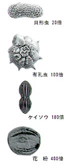花の咲く植物のおしべで作られる花粉は膜が強く地層の中にとじこめられても分解しません。風や水によってはこばれて地層の中に化石としてたくさん入っています。