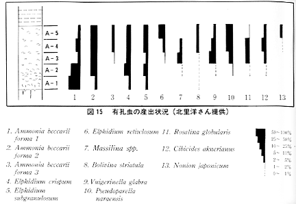 その種類は下の方から上にむかって大きく変化している。一番下の試料では湾の最も奥で塩分濃度が低い場所にすむ種類が圧倒的に多く、その上の試料では湾の中央の塩分の濃いところのものがふえてくる。