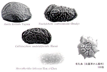 | 下部では沿岸の砂底にすむ種類が多く、内湾の泥底にすむ種類が混じっている。中部ではロの広い内湾の泥底にすむ種類が多く、それに沿岸の砂底の種類が混じっている。上部では内湾にすむ種類が多い。全体として黒潮の影響をうける浅い海の貝形虫ばかりで、寒流の影響下のものはみつからない。 |