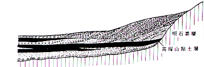 それぞれの地点で地層のようす、厚さ、重なり方を記録した図を柱状図といいます。その柱状図をならべたのが図19ですが、これをみると地層が横にどのように変化していくかがわかります。高塚山粘土層は南に追うとだんだん薄くなり、やがて粒のそろった砂層に変化します。また東および北に追うと薄くなり、傾斜した垂水礫層と呼ばれるこれより古い地層にぶつかっています。西に追うとだんだん厚くなり、伊川谷北高校のふきんでは2枚に、高塚山トンネル西口ふきんでは3枚にわかれてきます。