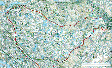 かなめのところでは標高は130mほどで扇の先端にいくほど低くなって30mの高さまで下がっていきます。