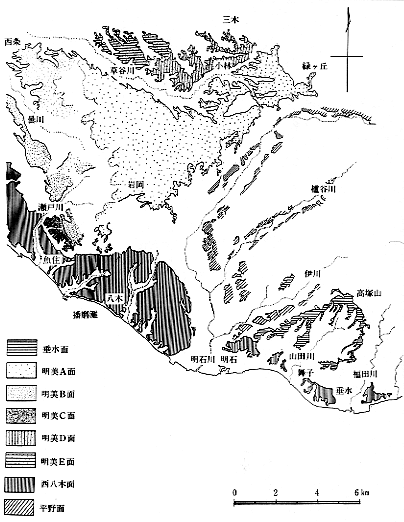 垂水面は幅がせまく谷によって切れこみをうけています。このように浸食をうけて平坦な面がけずられる現象を開析(かいせき)とよびます。垂水面がかなり開析をうけた面であるのに対して、明美面はあまり開析をうけていません。また垂水面も明美面も六甲山地の上昇の影響をうけて西に傾いていますが、その傾きが垂水面の方が大きいという事実があります。このことは、明美面は垂水面よりも新しく形成された面であるということを意味しています。
