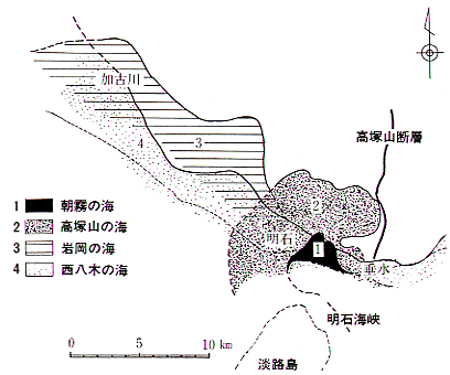 すなわち、赤坂粘土層をためた海は高塚山の海のあとにおとずれた海進によるものだということになります。加古川市に分布する日岡海成層も明美面のすぐ下にある地層ですからこの時にできたと考えられます。この海を岩岡の海とよぶことにします。