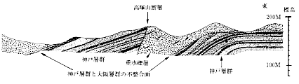 高塚山断層は、垂水区から北区にかけての地域で神戸層群と大阪層群の地層の分布を境する断層です。南北にのぴるこの断層を境にして、基本的には東がわには神戸層群があり、西がわには大阪層群があるといえます。正確にいえばこの断層の東がわでは大阪層群の地層はけずりとられてほとんど残っておらず、西がわでは神戸層群は地下にもぐっていて見えないといえます。