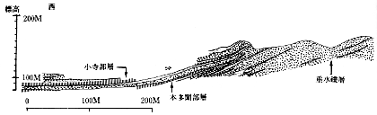 上の写真とスケッチは高塚山断層をよこぎる東西方向の地下鉄の路線ぞいでみられた地層の断面です。