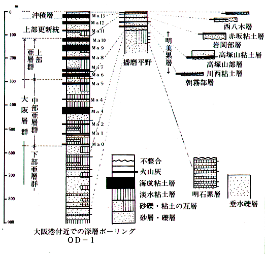 大阪平野(千里丘陵、泉南丘陵など) では、大阪層群の中に10数枚の海成粘土層がみつかっています。大阪港ふきんで掘られたボーリング調査でもそのことは確かめられています。
