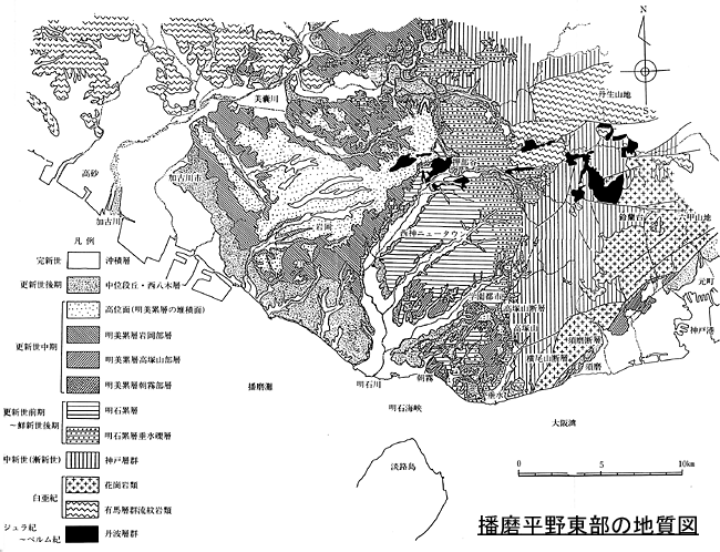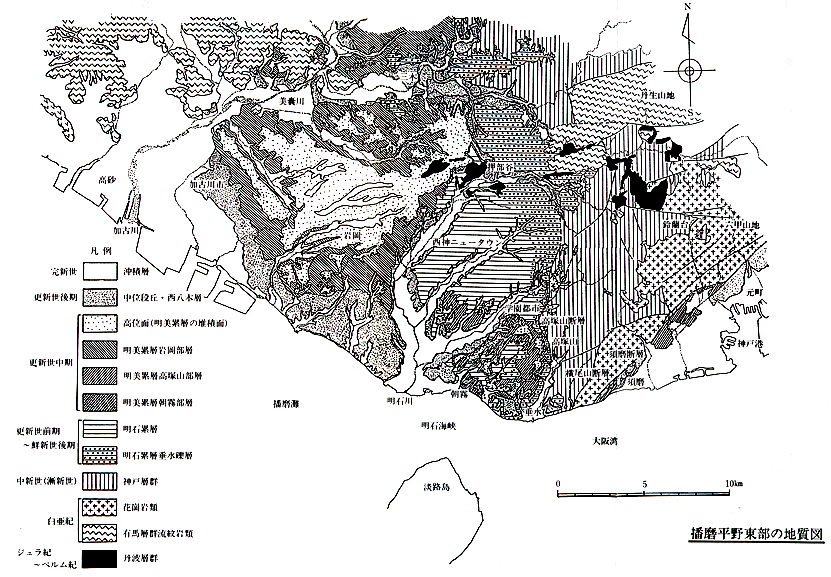 大阪層群は南北性の断層である高塚山断層より西、主に明石川流域と加古川左岸の30〜150m級の丘陵に分布している。