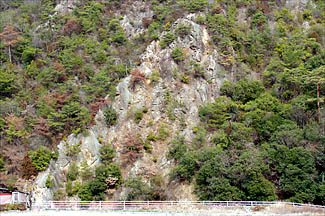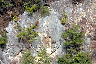 神戸市北区山田町、志染川にけずられた丹生山の流紋岩。