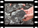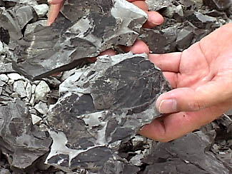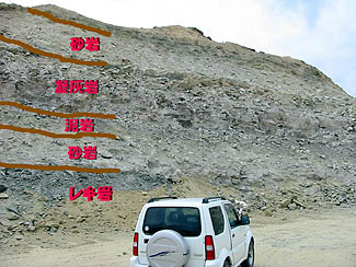 神戸層群について、地層先生が、神戸市西区押部谷町木津に現れた露頭(ろとう)で解説してくれます。 |