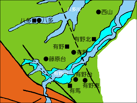 有野町、八多町付近は三田盆地につながる丘陵で神戸層群が広がっています。有野川、八多川の川原には沖積層がたまっていて、両岸に河岸段丘が見られます。